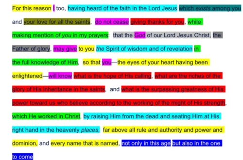 This is a follow up post to Why I Write. What’s the longest sentence in the Bible? That’s kind of a trick question. The longest sentence in the original Greek and the longest sentence in the modern English translations are in the same chapter, but they’re different verses. In Greek, Ephesians 1:3-14 is one sentence. One sentence! Come on, Paul! I love it, though. I can imagine Paul being so overwhelmed with the awesomeness of God that he just keeps writing. He did this – and this – and we have all this because of it. And then we come to Ephesians 1:15-21. These seven verses are just one sentence…